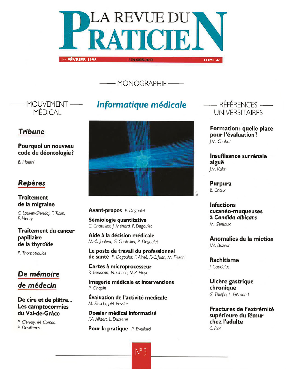 La parution récente au Journal officiel (mai 1995) du décret sur le codage des actes et des maladies indique clairement que l’évaluation de l’activité de la médecine ambulatoire est à l’ordre du jour. Là encore, rien ne pourra être fait sans le concours de l’outil informatique. Les incitations actuelles à l’informatisation des praticiens, telles qu’elles ont été formulées récemment, en sont la meilleure preuve.