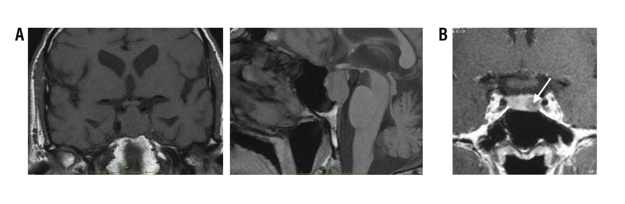 - hyperprolactinémie de déconnexion, liée à une compression de la tige pituitaire, qui entraîne une levée du signal inhibiteur de la dopamine (macro-adénome à l’imagerie par résonance magnétique [IRM] et prolactinémie < 200 ng/mL).