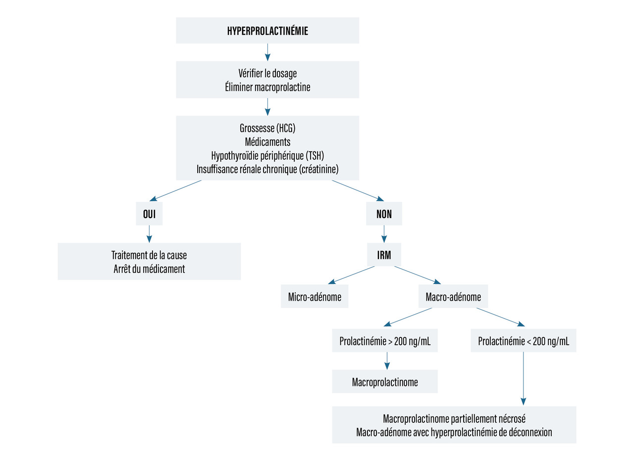 L’hyperprolactinémie doit être confirmée par un dosage en laboratoire spécialisé, elle peut être secondaire à une prise médicamenteuse (psychotropes) même si elle est le plus souvent liée à un adénome à prolactine. La sécrétion est proportionnelle à la taille. Ainsi une valeur de prolactinémie peu élevée (< 200 ng/mL) en regard d’un macro-adénome fait évoquer une hyperprolactinémie de déconnexion.