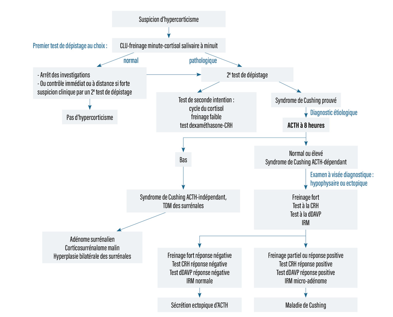 La découverte d’un syndrome de Cushing (dépistage de première intention par cortisol libre urinaire ou cortisol salivaire à minuit ou freinage minute, test de deuxième intention par le cycle du cortisol ou le freinage faible à la dexaméthasone) impose un diagnostic étiologique reposant sur l’ACTH à 8 h dans un premier temps. Si celui-ci est normal ou élevé, d’autres tests distinguent la maladie de Cushing (adénome corticotrope) de la sécrétion ectopique d’ACTH (d’origine tumorale).