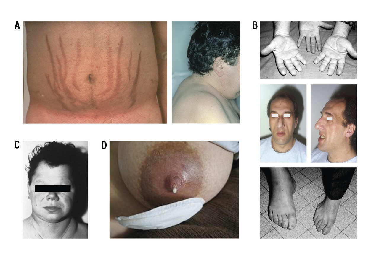 Chez la femme, des signes d’hyperandrogénie se développent : hirsutisme, hyperséborrhée, voire acné. Par ailleurs, l’hypercorticisme induit un hypogonadisme hypogonadotrope fonctionnel avec spanioménorrhée, voire aménorrhée, chez la femme et impuissance chez l’homme, ainsi qu’une baisse de la libido.
