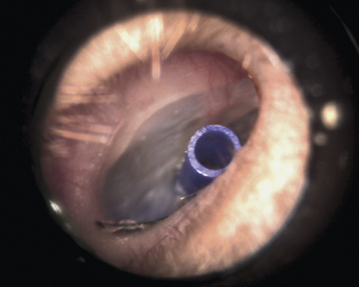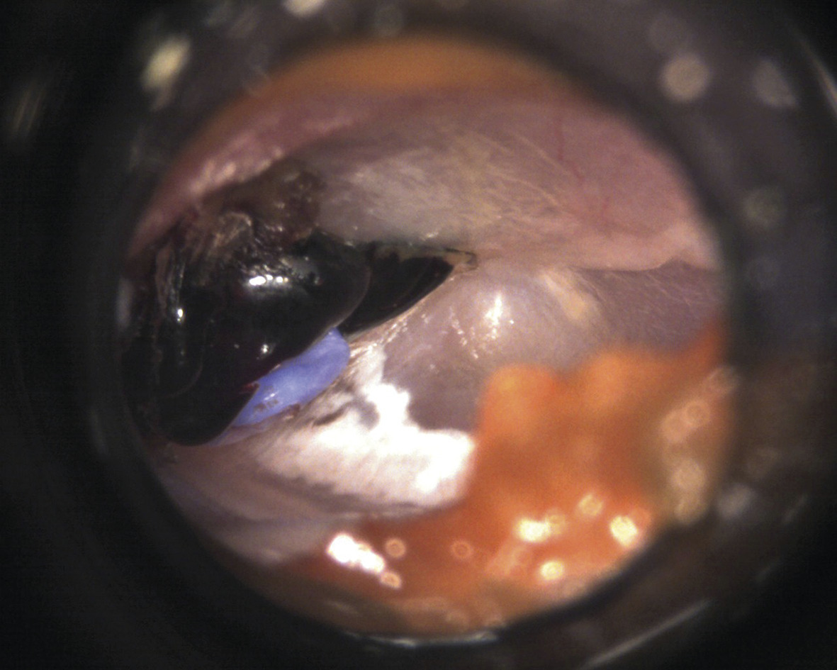 Otorrhée ou otorragie secondaire à la présence de l’aérateur (semaines ou mois après). Le saignement provient d’un granulome à la base de l’ATT, dû à l’infection. Traitement probabiliste par gouttes auriculaires actives sur Pseudomonas aeruginosa et Staphylococcus aureus (ofloxacine, ciprofloxacine) pendant 5 à 7 jours.4 Prélèvement microbiologique nécessaire seulement en cas d’échec. Cet écoulement peut boucher l’aérateur, facilitant son expulsion.