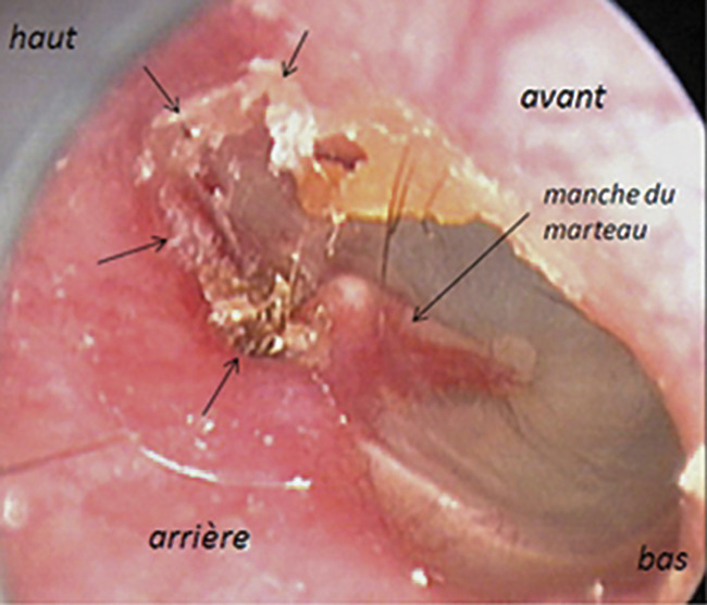 Cholestéatome (fig. 3) résultant lui aussi de la pathologie otitique sous-jacente. Il nécessite de surveiller les oreilles 1 à 2 ans après guérison.
