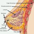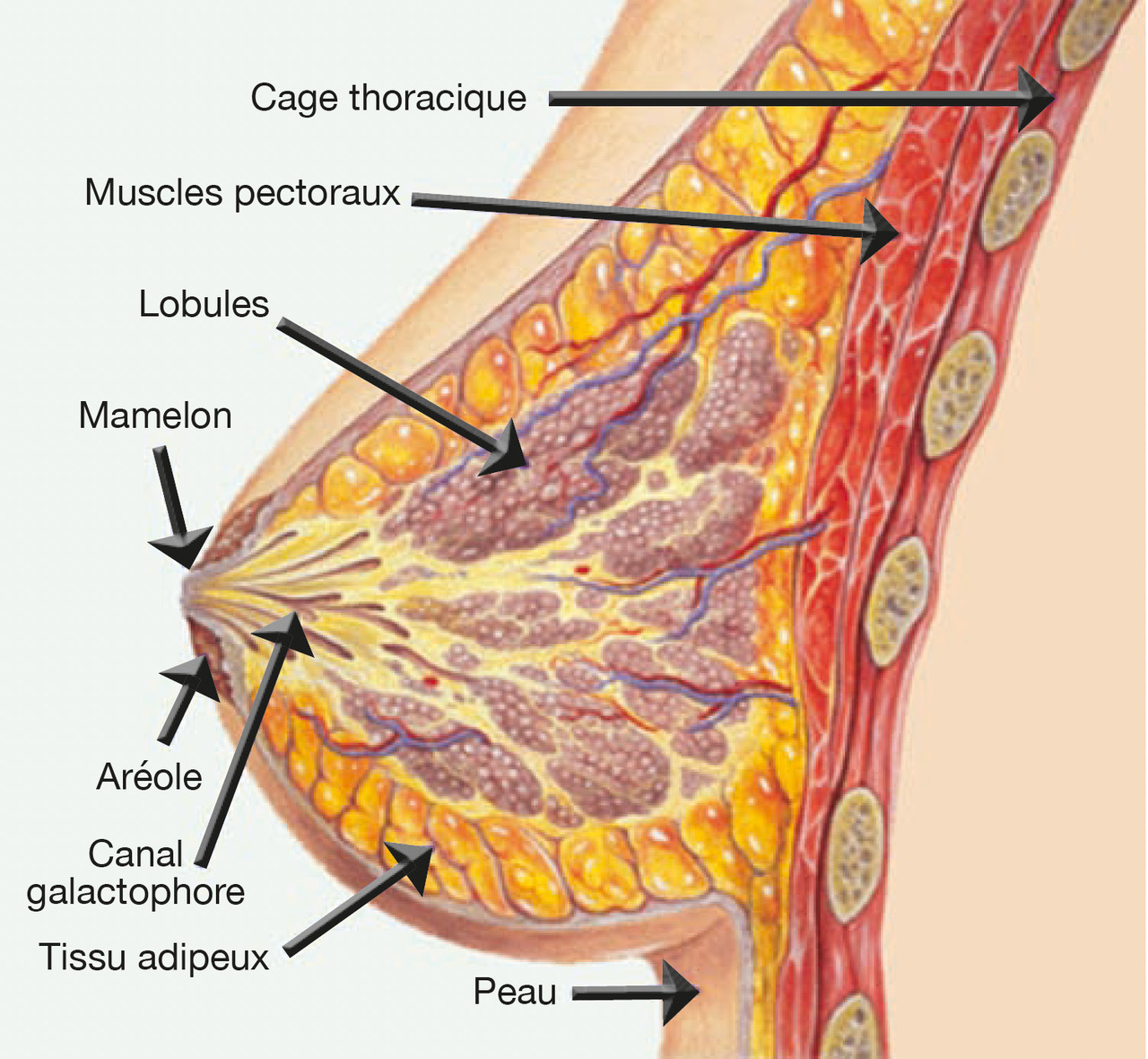 Chaque sein est composé d’une glande mammaire qui est une masse de densité variable (fig. 1). Elle est organisée en une vingtaine de lobes, chaque lobe est composé de 20 à 40 lobules et chaque lobule contient de 10 à 100 alvéoles. L’alvéole (ou acinus) est l’unité de base constituant la partie sécrétrice de la glande, se drainant par un canal alvéolaire (canal galactophore de troisième ordre).