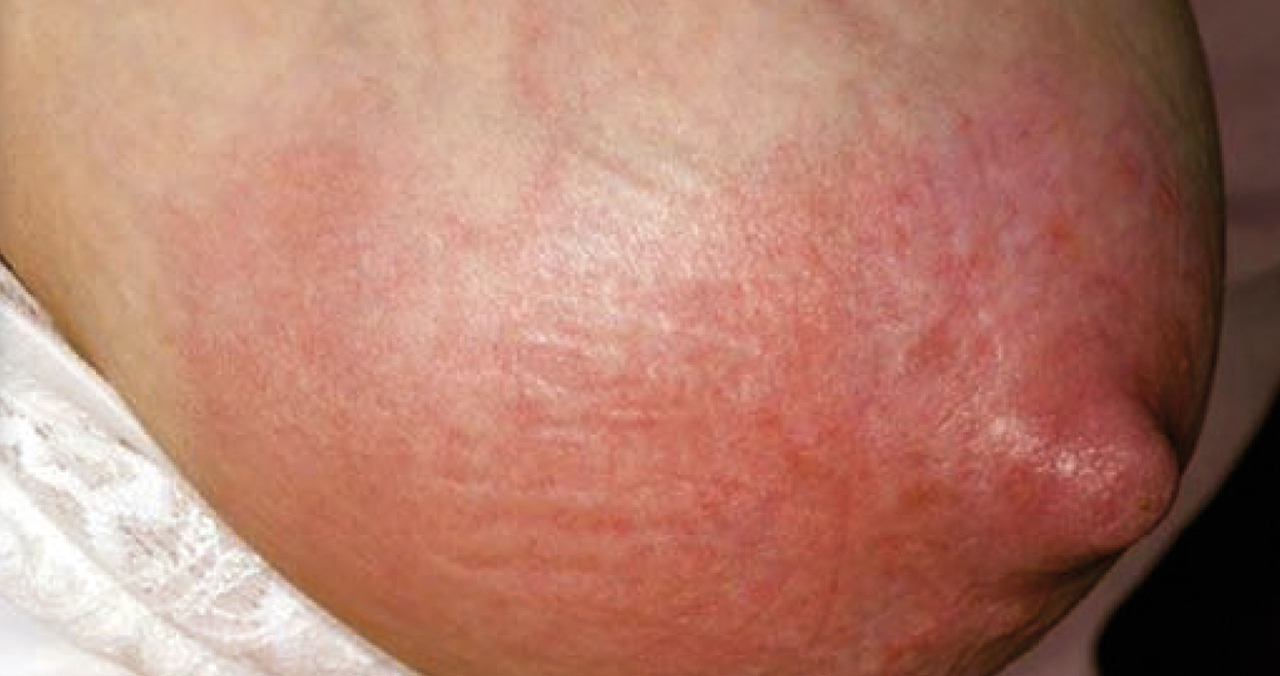 - placard rouge, chaud, douloureux occupant un quadrant du sein avec traînée inflammatoire en direction de l’aisselle, adénopathie(s) axillaire(s) satellite(s) douloureuse(s) [fig. 4] ;