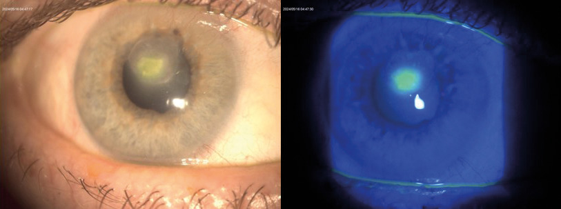De causes multiples (encadré 1), la kératite associe une baisse d’acuité visuelle plus ou moins profonde à des symptômes d’atteinte de la surface oculaire : hyperhémie conjonctivale et cercle périkératique, photophobie, larmoiement, douleur superficielle ou profonde. L’examen à la lampe à fente met en évidence des lésions cornéennes avec perte de la transparence cornéenne et une prise de fluorescéine en cas d’ulcération épithéliale (fig. 2).