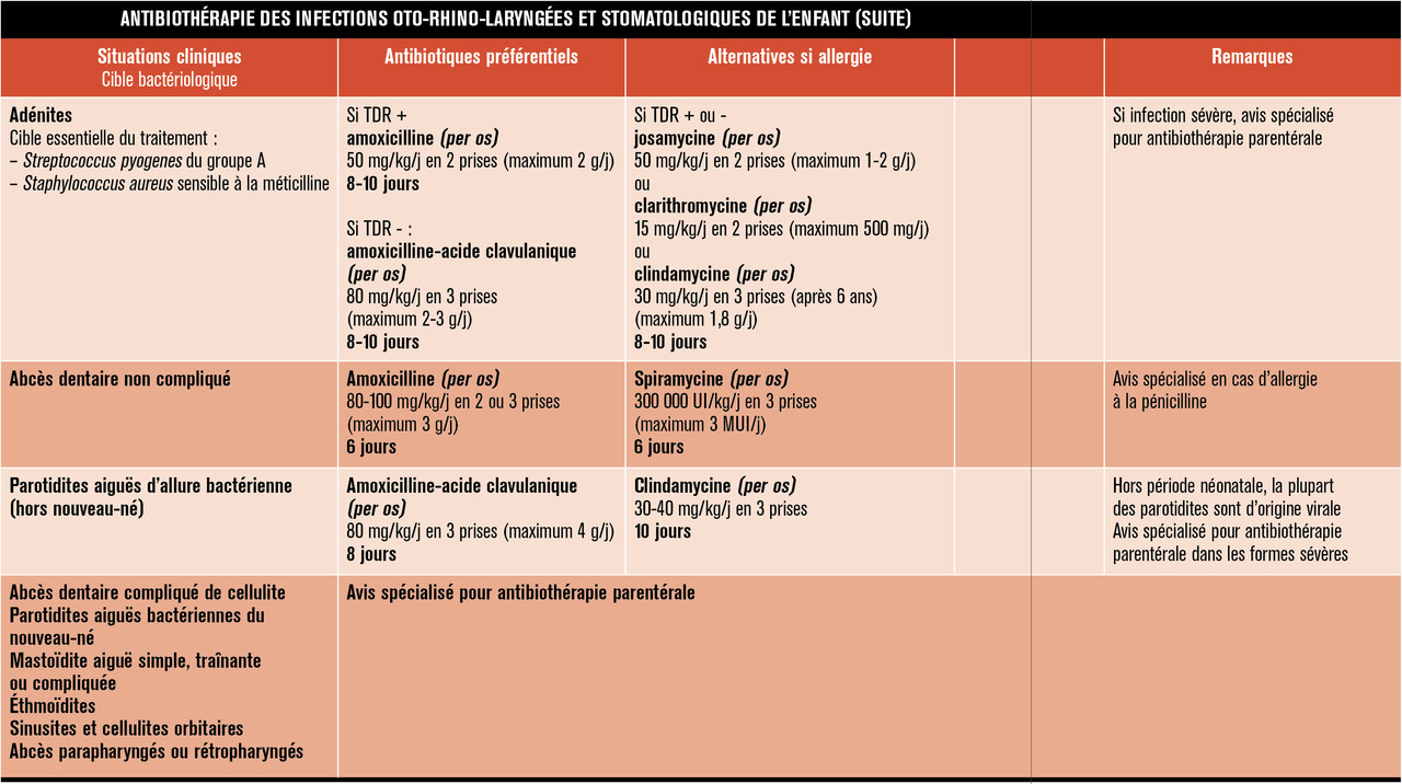Le tableau 1 présente, pour les infections ORL et stomatologiques, les différentes situations cliniques, les cibles du traitement antibiotique, l’antibiothérapie préférentielle ainsi que les alternatives en cas d’allergie en pédiatrie.5, 6