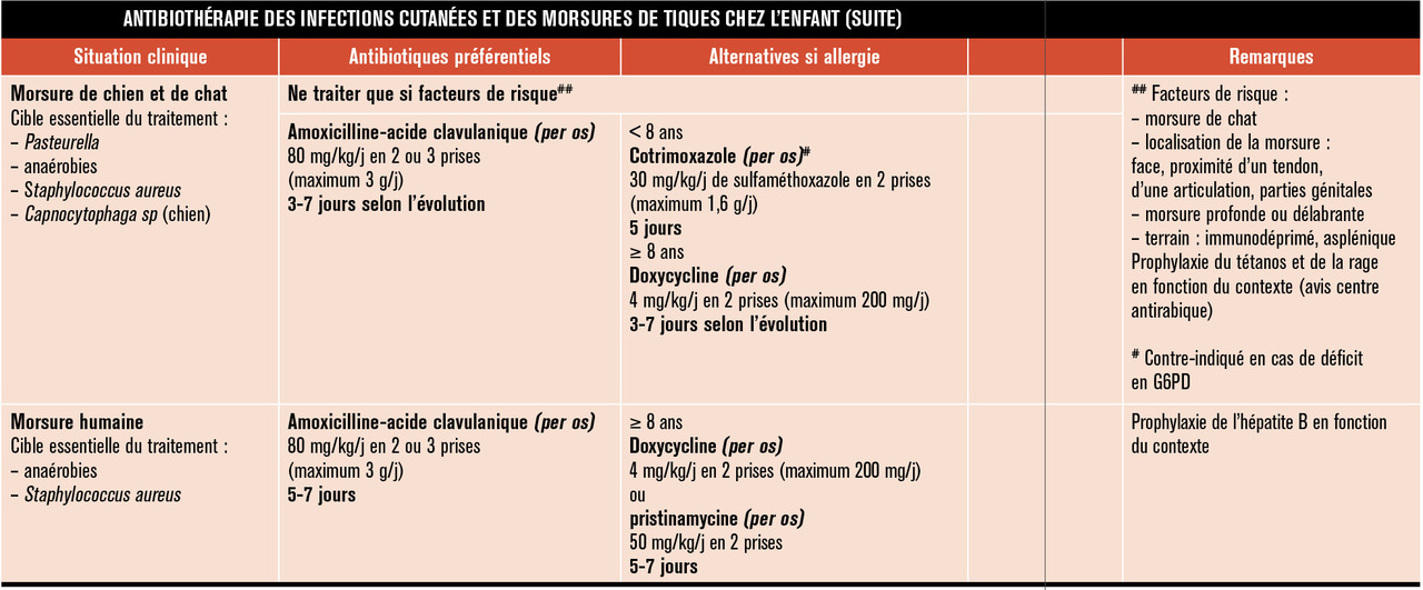 Le tableau 4 présente, pour les infections cutanées et les morsures, les différentes situations cliniques, les cibles du traitement antibiotique, l’antibiothérapie préférentielle ainsi que les alternatives en cas d’allergie en pédiatrie.5, 6