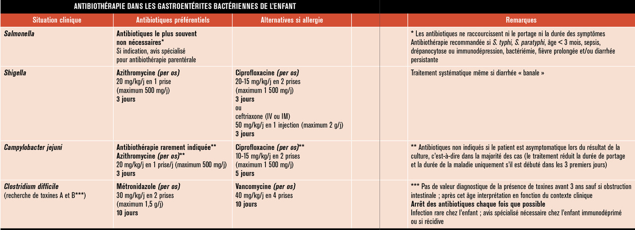 Les gastro-entérites sont le plus souvent virales et ne nécessitent que très rarement une antibiothérapie. Même en cas de cause bactérienne trouvée à la coproculture, le traitement antibiotique ne doit pas être systématique. En effet, il n’apporte que peu ou pas de bénéfice au-delà des trois premiers jours de gastro-entérite à Campylobacter jejuni et dans la majorité des salmonelloses non compliquées (hors S. typhi, S. paratyphi, âge < 3 mois, sepsis, drépanocytose ou immunodépression, bactériémie, fièvre prolongée et/ou diarrhée persistante).