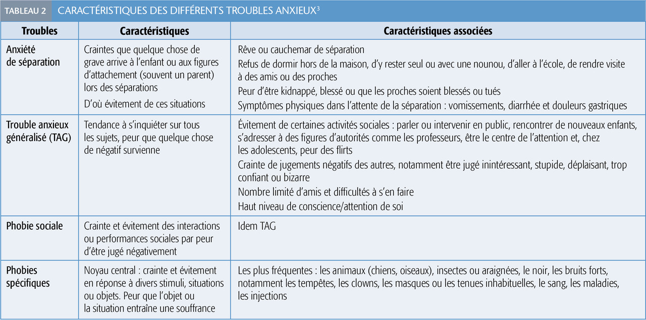 Les troubles anxieux, à l’inverse, sont des peurs excessives ou inadaptées pour l’âge, durables, avec un impact psychique et fonctionnel important (repli au domicile, évitement scolaire, voire déscolarisation). Ces troubles sont sous-diagnostiqués chez l’enfant et l’adolescent alors qu’ils sont particulièrement fréquents entre 6 et 18 ans, avec une prévalence estimée entre 8 et 30 %. 2 Les principales complications comme la dépression, l’abus de substances à l’adolescence, la chronicisation à l’âge adulte, la déscolarisation requièrent toute l’attention des cliniciens.