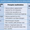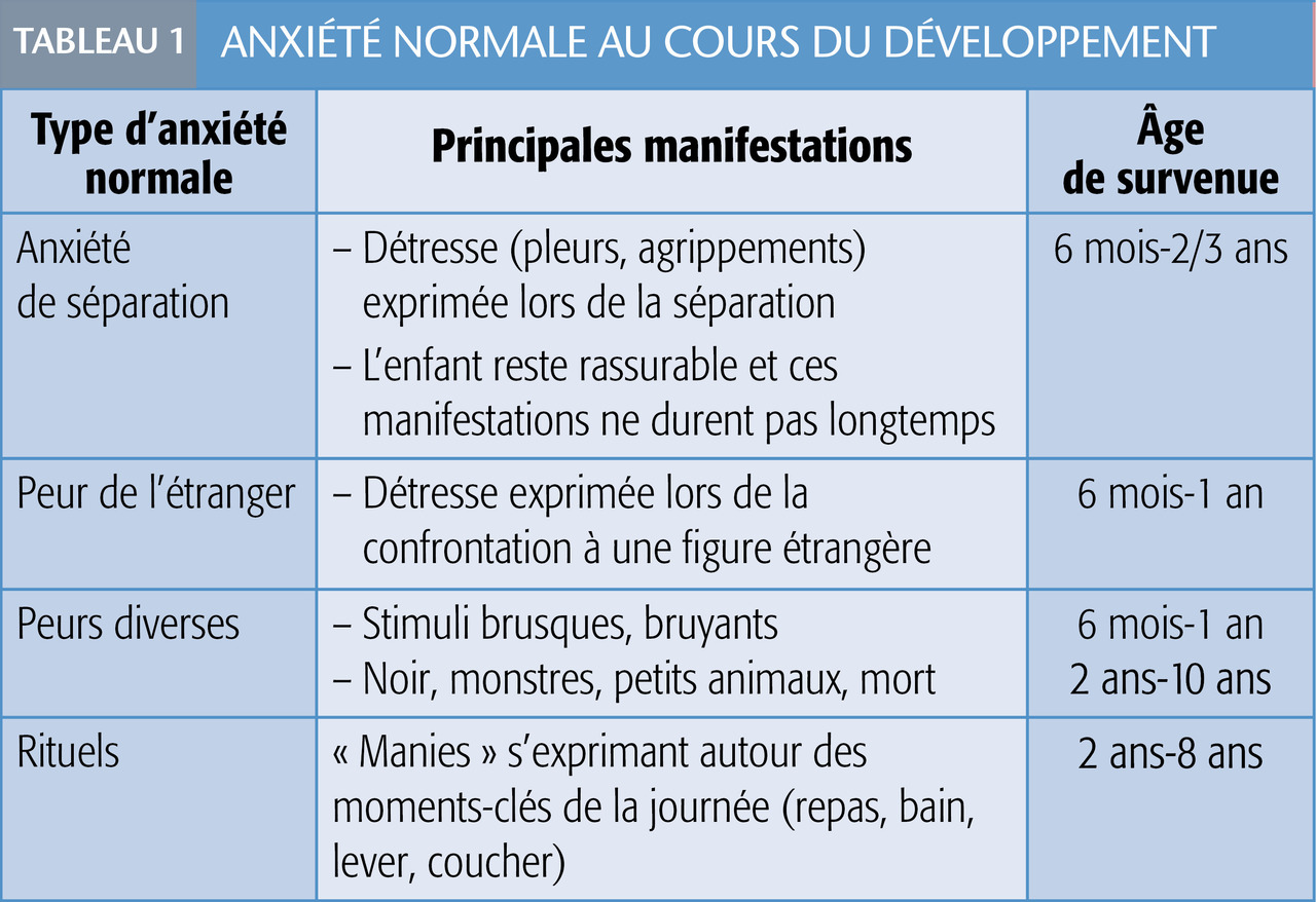 Certaines peurs, variables selon l’âge de développement affectif et cognitif de l’enfant, sont normales si elles sont transitoires (comme celle de l’étranger vers 7-8 mois ; tableau 1 ), si elles concernent des préoccupations habituelles et surtout n’entraînent ni souffrance psychique, ni évitement de situations sociales ou scolaires, ni retentissement fonctionnel important. 1