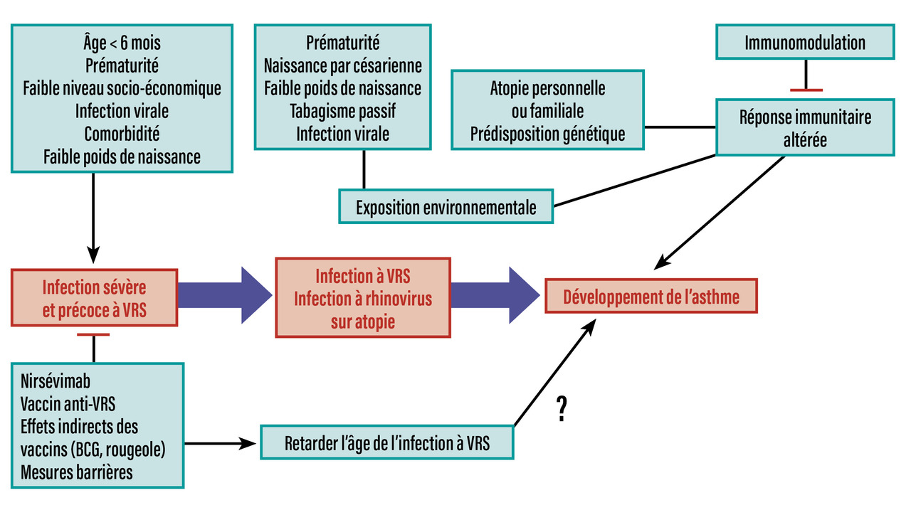 Les poumons normaux sont caractérisés par une abondance faible du microbiote dont le développement est intense durant les premiers mois de vie, pour se stabiliser dès l’âge de deux ans. Une dysbiose respiratoire chez le nourrisson, combinée avec un dysfonctionnement des cytokines pro-inflammatoires de l’épithélium nasal lors d’une infection virale, peut augmenter le risque de développer une maladie respiratoire dans la première année de vie, et ensuite de l’asthme. Les stratégies préventives ciblent donc les infections virales, en premier lieu celle à virus respiratoire syncytial (VRS).9 L’arrivée, depuis 2023, du nirsévimab, anticorps monoclonal actif en une seule injection couvrant toute la période hivernale, devrait permettre de réduire encore le risque chez tous les nourrissons ; toutefois, il n’y a aucune donnée à l’heure actuelle concernant la prévention de l’asthme par le nirsévimab. L’arrivée d’un vaccin anti-VRS administré aux femmes enceintes devrait renforcer cette stratégie. En dehors de ces actions dirigées contre le VRS, des préventions alternatives sont à l’étude concernant une immunomodulation par le vaccin contre la rougeole ou le BCG.6