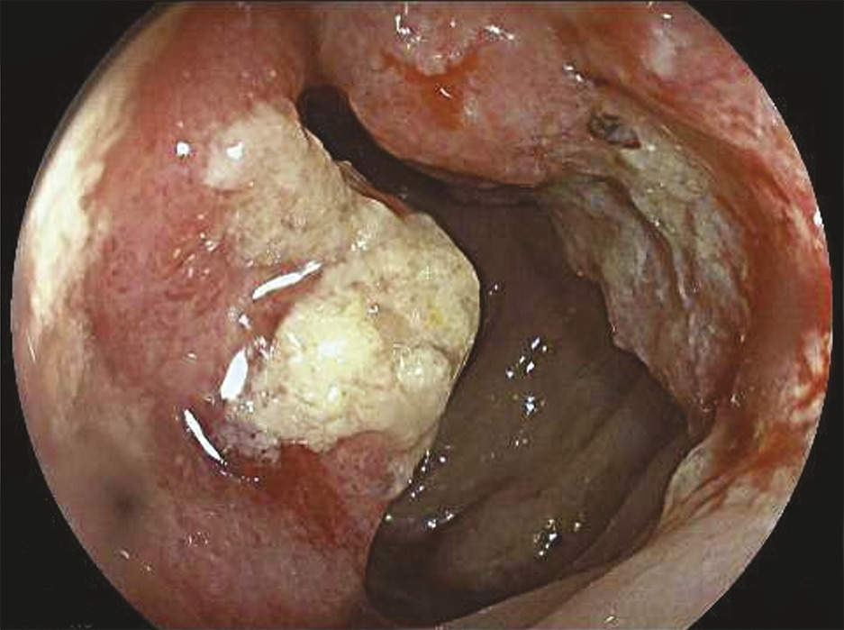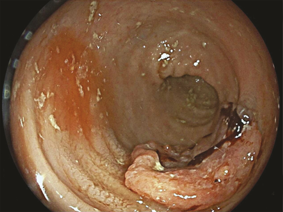 La coloscopie, sous anesthésie générale, est l’examen de première intention dans la plupart des cas de rectorragies. Si elle met en évidence une tumeur rectale, elle peut être complétée immédiatement ou dans un second temps par une rectoscopie rigide, permettant d’évaluer plus précisément la distance entre le pôle inférieur de la tumeur et la marge anale (mesure la plus reproductible) et/ou le pôle supérieur du sphincter. L’examen endoscopique permet également de décrire la lésion rectale (taille, aspect macroscopique, circonférence d’implantation) et de recueillir de multiples biopsies, indispensables au diagnostic (fig. 1 et 2 ).