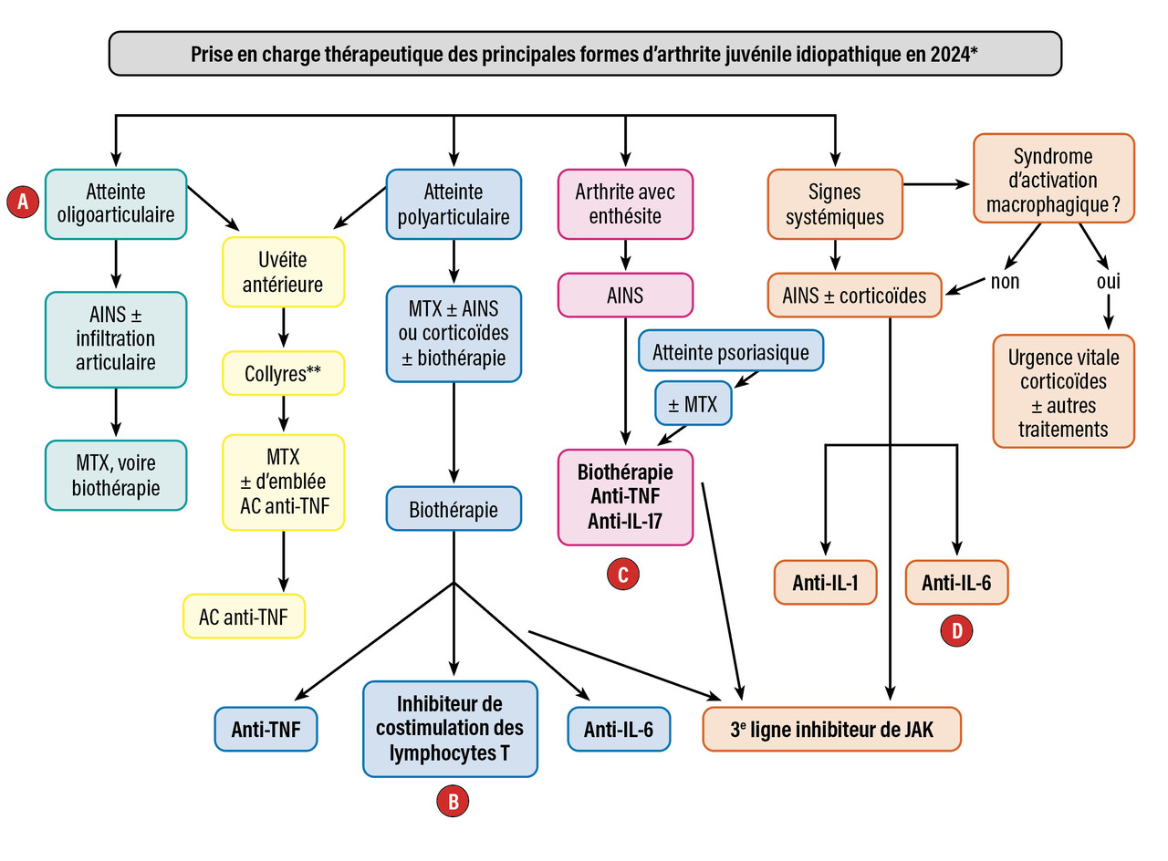 Le choix de la biothérapie et de la petite molécule dépend principalement du sous-groupe de l’AJI et des symptômes prédominants (arthrite, uvéite, signes systémiques) [figure ]. L’approche thérapeutique classique est d’utiliser les traitements conventionnels tels que les disease modifying antirheumatic drugs (DMARD ; par exemple, le méthotrexate [MTX]) en première intention et de considérer les biothérapies et petites molécules uniquement chez les patients non répondeurs. Mais, même si la plupart des autorisations de mise sur le marché (AMM) suivent encore le schéma classique, l’utilisation précoce des biothérapies est de plus en plus fréquente.