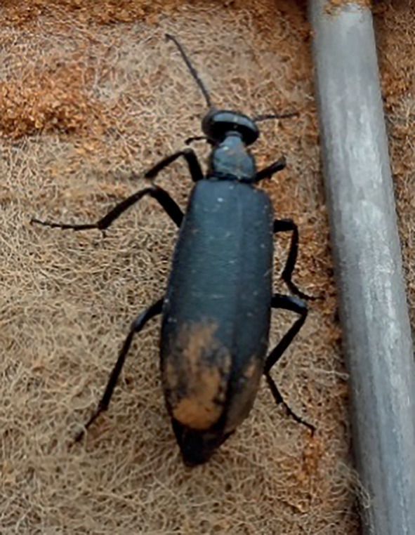 La cantharide, Lytta vesicatoria, est un coléoptère de 12 à 21 mm de long (fig. 2), dont l’aire géographique s’étend de l’Europe méridionale et centrale à l’Asie, en passant par l’Afrique tempérée et l’Amérique. Cet insecte sécrète sur tout son corps une substance toxique, la cantharidine, qui provoque des brûlures cutanées et muqueuses. En raison du délai entre le contact vésicant et la réaction cutanée, l’origine peut échapper au patient.