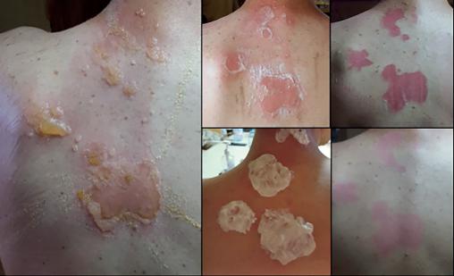 Après désinfection cutanée et évacuation du liquide phlycténulaire (sans le répandre ++ ; fig. 1c), on applique une crème antiseptique (sulfadiazine argentique sous pansement). Un antalgique (type paracétamol) peut être nécessaire. L’amélioration est nette en 3 jours (fig. 1d) et la guérison effective en 10 jours (fig. 1e).