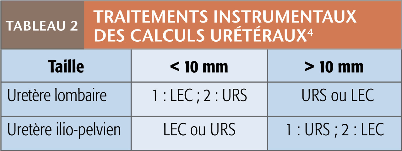La première évaluation des fragments résiduelsest faite à 1-3 mois. Elle impose un ASP et une échographie rénale et, en cas de calculs d’acide urique (radiotransparents) gérés par alcalinisation, un scanner faible dose non injecté centré sur les reins ou une échographie.2 Si les fragments mesurent moins de 5 mm et sont asymptomatiques, un contrôle est fait à 6 et 12 mois, puis tous les ans.2 Ceux symptomatiques ou de taille supérieure à 5 mm doivent être traités. La LEC ou l’URSS sont alors des options, en tenant compte des indications (tableaux).