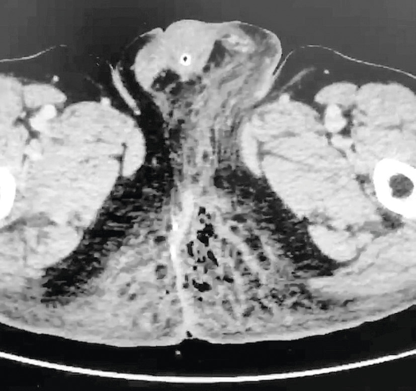 Il s’agit d’une urgence, car elle peut rapidement évoluer vers une défaillance multiviscérale. Il est important de ne pas méconnaître ce diagnostic ; en effet, les signes locaux du début ont une allure banale mais peuvent rapidement évoluer. Ainsi, le placard cutané, initialement érythémateux et œdémateux, devient ensuite infiltré et d’extension rapide vers le scrotum, les plis inguinaux, les lombes, etc. Le crépitement sous-cutané et le suintement verdâtre fétide caractéristiques sont tardifs. À ce stade, les signes systémiques (fièvre ou hypothermie, collapsus, confusion, etc.) sont quasiment constants. La mise en évidence de « bulles » en tomodensitométrie (