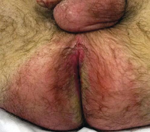 Un homme de 45 ans, diabétique, consulte aux urgences pour une douleur anale, pour laquelle il prend des anti-inflammatoires non stéroïdiens (AINS) depuis quatre jours. À l’examen, un érythème des deux fesses s’étend vers le scrotum (