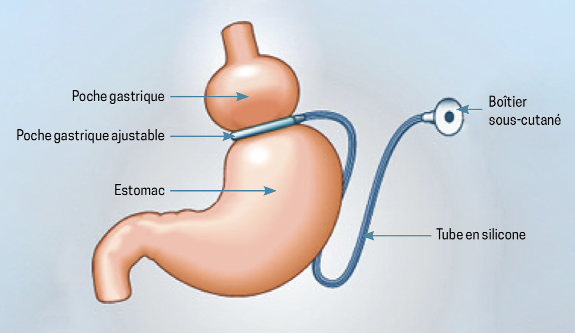 L’anneau gastrique ajustable (AGA) est une intervention qui consiste à placer un anneau ajustable autour de la partie supérieure de l’estomac pour limiter l’apport alimentaire (fig. 4). Cette technique est aujourd’hui quasiment abandonnée et trouve ses dernières indications chez les patients ne tolérant pas la malabsorption et/ou nécessitant une technique facilement réversible.