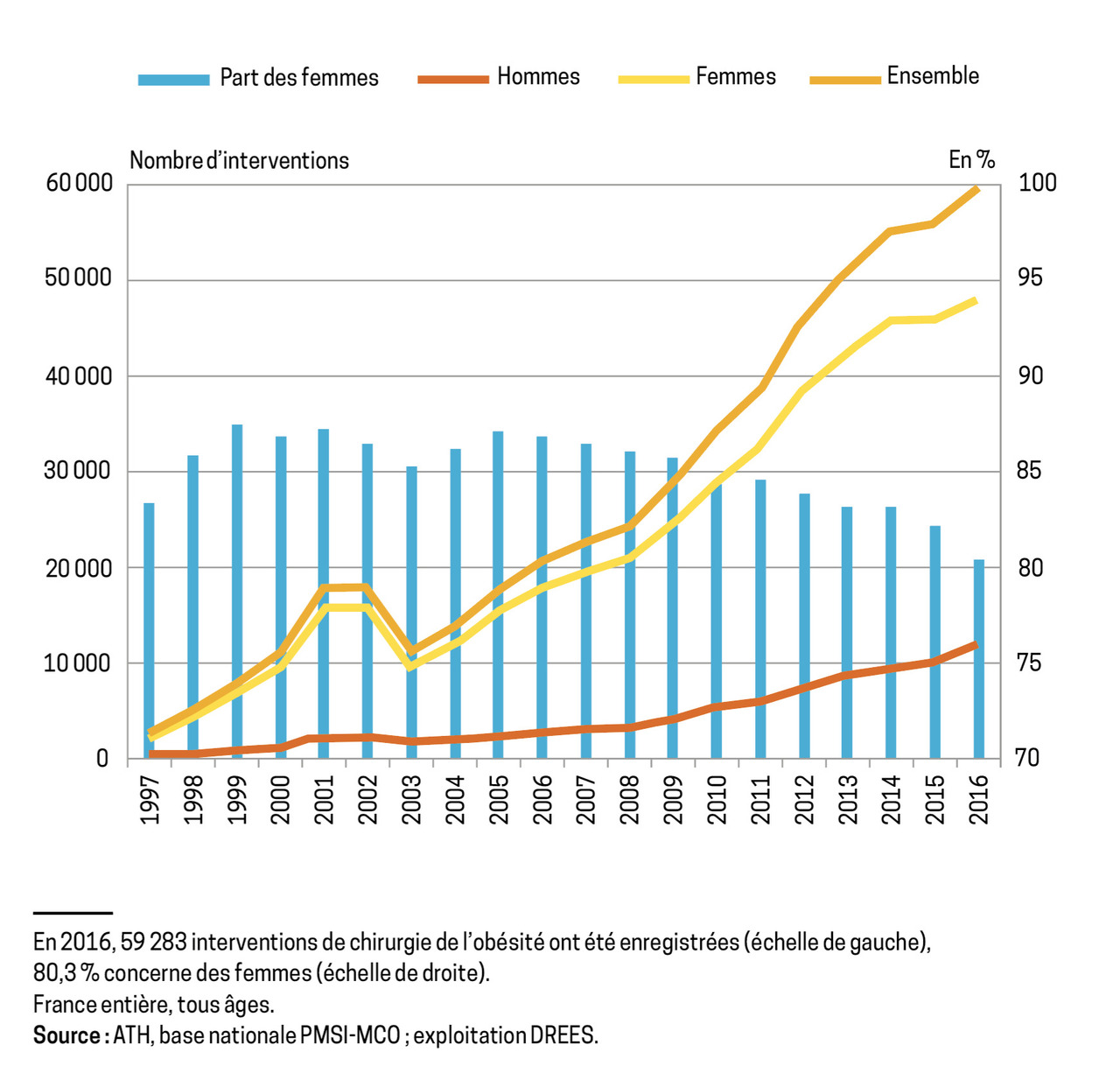 La chirurgie bariatrique est un traitement efficace de l’obésité en seconde intention, après un traitement médical bien conduit durant six à douze mois. Entre 2022 et 2024, la HAS a mis à jour ses recommandations concernant la chirurgie bariatrique, les précédentes datant de 2009. Plusieurs techniques ont fait la preuve de leur efficacité. Ces interventions chirurgicales peuvent être restrictives (anneau, sleeve gastrectomie) en réduisant la taille de l’estomac, ou peuvent associer de la malabsorption à des degrés divers selon la procédure (bypass ou duodenal switch) en modifiant l’anatomie du système digestif. Les pertes de poids obtenues grâce à ces interventions sont significatives et durables. Ainsi, près de 3 % de la population française a bénéficié d’une chirurgie bariatrique, avec un nombre croissant d’interventions (fig. 1).