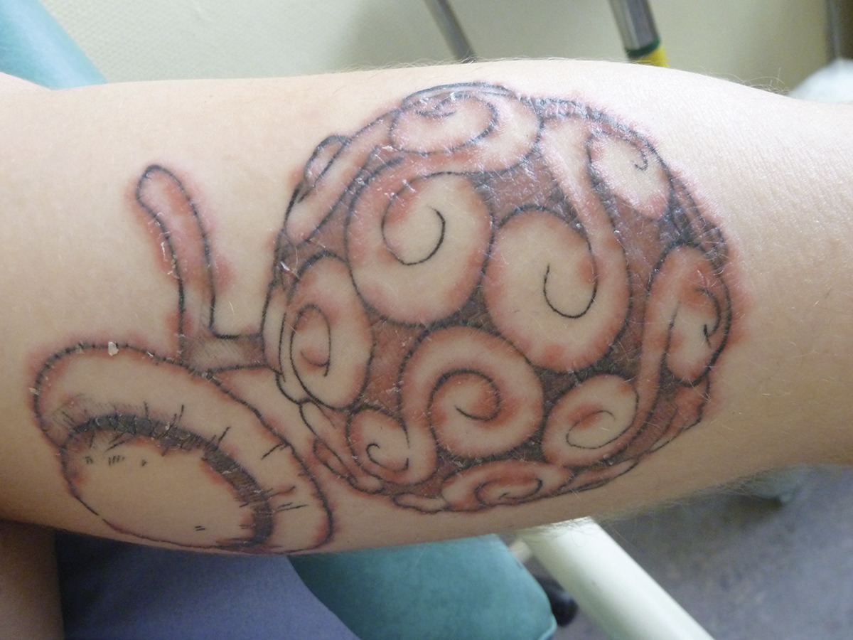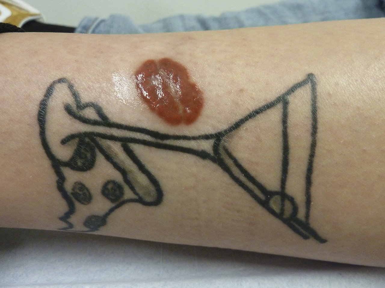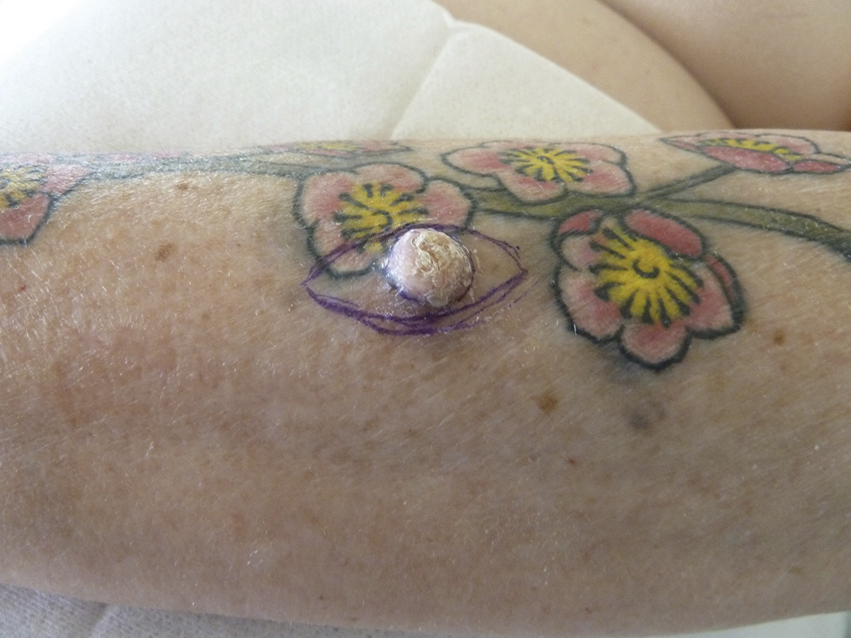 À ce jour, seul le kérato-acanthome semble associé à la pratique du tatouage. Il s’agit d’une tumeur cutanée de malignité intermédiaire, apparentée au carcinome épidermoïde, qui apparaît rapidement après la confection du tatouage. Il peut être unique ou multiple éruptif (fig. 4 ). Son traitement est l’exérèse chirurgicale. Les autres cancers cutanés sur tatouage sont actuellement considérés comme fortuits.5 Le mélanome se développe le plus souvent de novo au sein du tatouage. Mais ce dernier peut masquer sa détection précoce, et le diagnostic peut être tardif. Un tatoueur peut également tatouer un grain de beauté accidentellement ou une lésion déjà suspecte.
