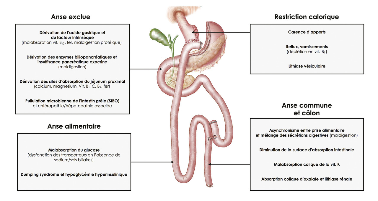 Une diarrhée chronique après chirurgie bariatrique est inhabituelle et doit faire évoquer un syndrome de malabsorption.1, 3, 4 La malabsorption est alors favorisée par :