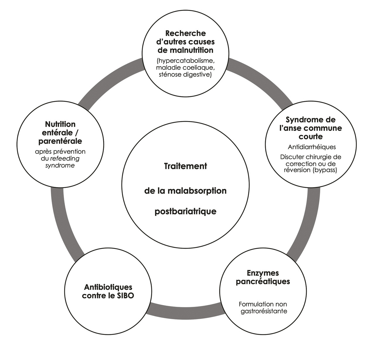 – et une prolifération bactérienne dans l’anse d’intestin grêle exclue ou SIBO (small intestinal bacterial overgrowth). La SIBO aggrave la malabsorption en induisant une atrophie villositaire, une entéropathie exsudative et une déconjugaison bactérienne des acides biliaires.3 La dénutrition protéique et la SIBO peuvent aussi induire une hépatopathie (rôle pro-inflammatoire et fibrosant des endotoxines et de la flore anaérobie, perturbation du métabolisme des acides biliaires). En raison de changements anatomiques dus à la chirurgie, la SIBO peut être difficile à prouver et un traitement antibiotique empirique d’épreuve peut être proposé.3 Les autres causes de diarrhée après chirurgie bariatrique sont l’infection à Clostridium difficile, les effets secondaires des médicaments, la diarrhée cholérétique (soulagée par la cholestyramine), l’exacerbation d’une neuropathie entérique diabétique ou l’apparition d’une maladie cœliaque/inflammatoire de l’intestin. En pratique, toute diarrhée chronique associée à un syndrome de malabsorption ou à des anomalies du bilan hépatique doit être évaluée par le centre expert référent. Après avoir traité d’éventuels facteurs favorisants (sténose digestive, complication infectieuse), une renutrition orale ou entérale et un traitement de la diarrhée par malabsorption résolvent généralement la malnutrition et l’hépatopathie (