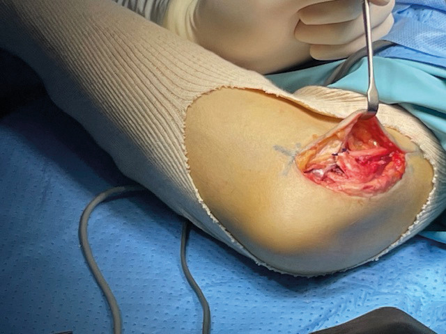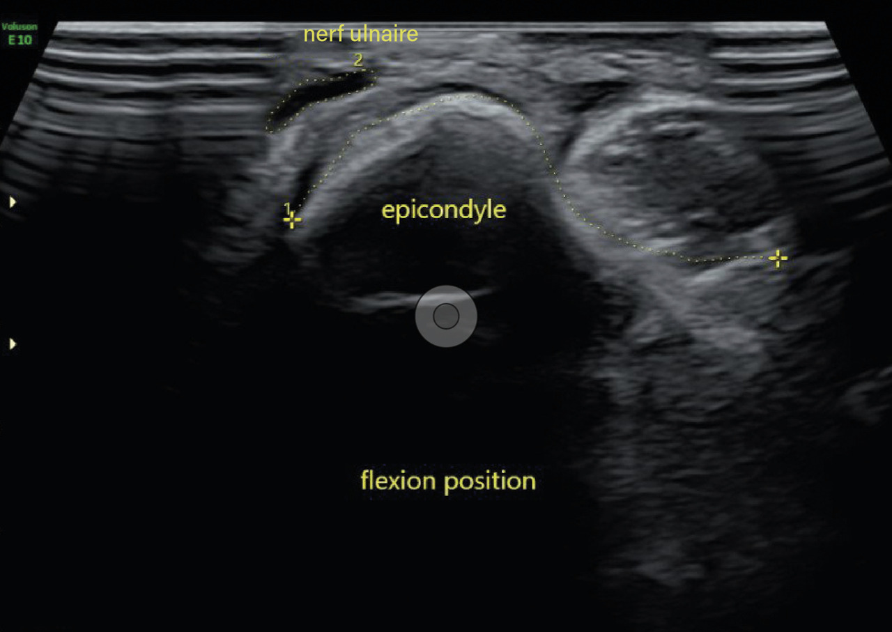 Deux ans après le premier épisode, il reconsulte pour le même motif. Un nouvel EMG révèle un ralentissement de la vitesse de conduction du nerf ulnaire droit au niveau du coude. Une échographie dynamique du coude met en évidence un gonflement fusiforme du nerf ulnaire dans la gouttière cubitale ainsi qu’une luxation du nerf ulnaire au-delà de la tubérosité condylienne lors de la flexion de l’avant-bras sur le bras (fig. 1 et 2). Une transposition cubitale est effectuée (fig. 3) permettant la disparition des symptômes en quelques semaines.