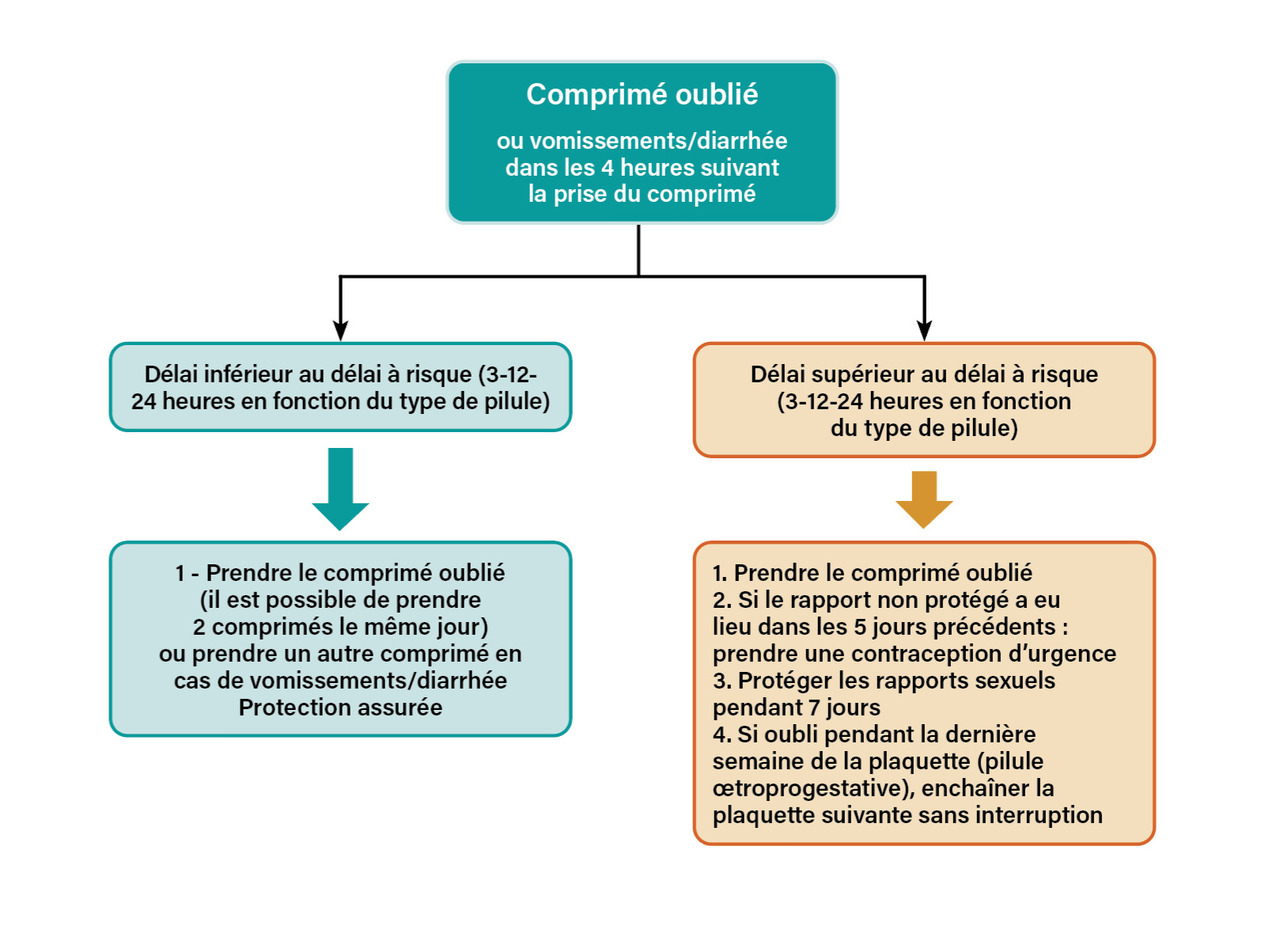La Haute Autorité de santé (HAS) recommande de proposer en première intention une contraception œstroprogestative associant le lévonorgestrel et l’éthinylestradiol en raison de son plus faible risque thromboembolique veineux.3 En matière d’efficacité, il n’a pas été démontré de différence entre les contraceptions œstroprogestatives faiblement dosées (≤ 20 µg d’éthinylestradiol) et les dosages plus élevés.4 En revanche, on note une fréquence plus importante de saignements non prévus pouvant entraîner un défaut d’observance pour les contraceptions œstroprogestatives les moins dosées en éthinylestradiol. Le taux d’échec de ce type de contraception reste élevé dans cette tranche d’âge en raison du défaut d’observance.5 Lorsqu’une contraception par voie orale est prescrite, il est nécessaire d’informer sur la conduite à tenir en cas d’oubli (fig. 1). Il est également possible de prescrire une contraception d’urgence afin que la patiente puisse toujours en disposer avec elle en cas de besoin.