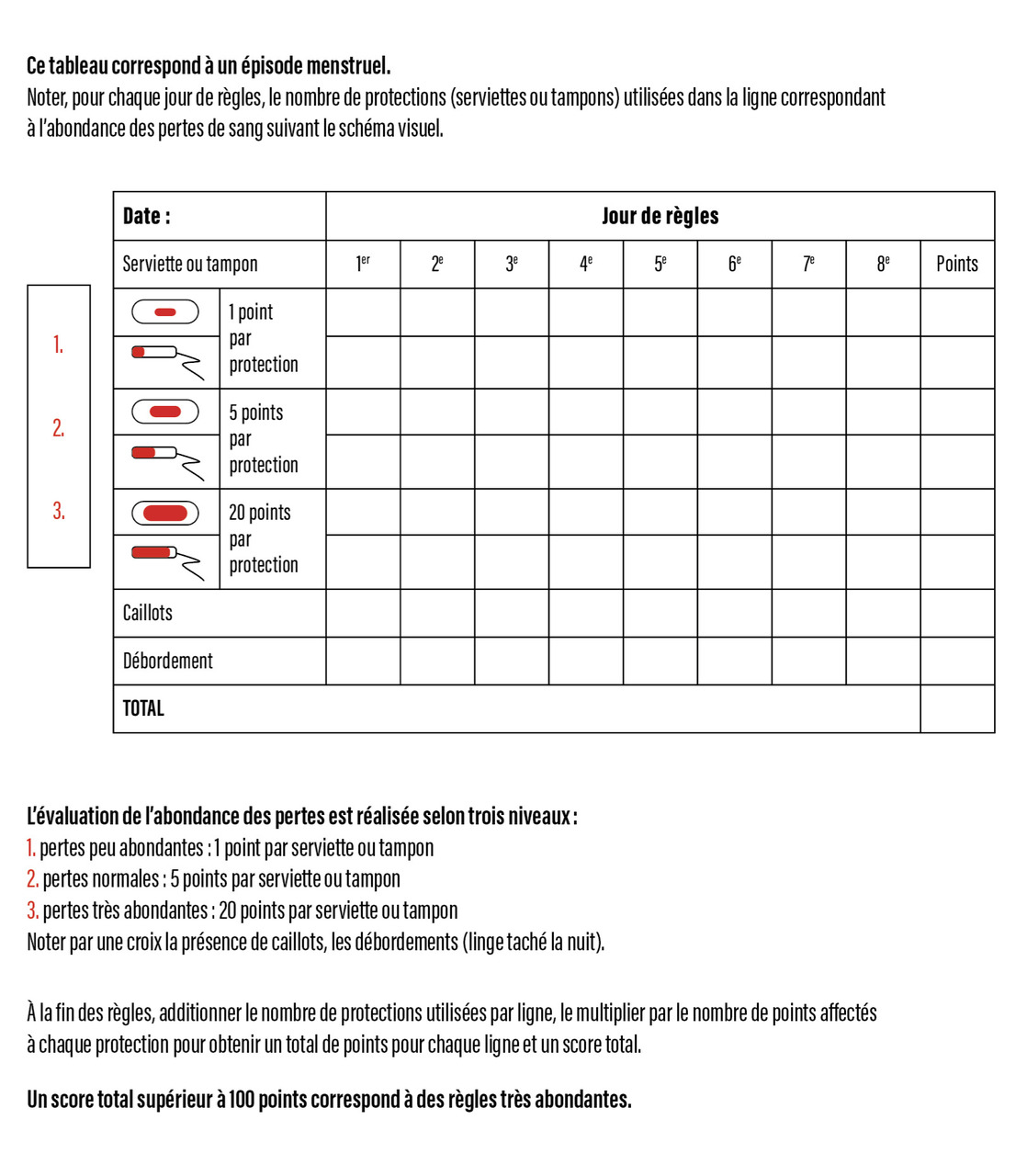 À l’adolescence, lors des premières années de menstruations, les troubles du cycle, et notamment les saignements utérins abondants, sont fréquents et principalement liés à une dysfonction ovulatoire secondaire à l’immaturité de l’axe hypothalamo-hypophyso-ovarien. Ils doivent être objectivés en utilisant le score de Higham (fig. 2).9 Ils peuvent être le seul signe d’une maladie hémorragique, c’est pourquoi ils doivent faire rechercher un trouble de l’hémostase.10 Il est également nécessaire de proposer une échographie pelvienne, pour éliminer une pathologie organique qui serait à l’origine des saignements abondants.