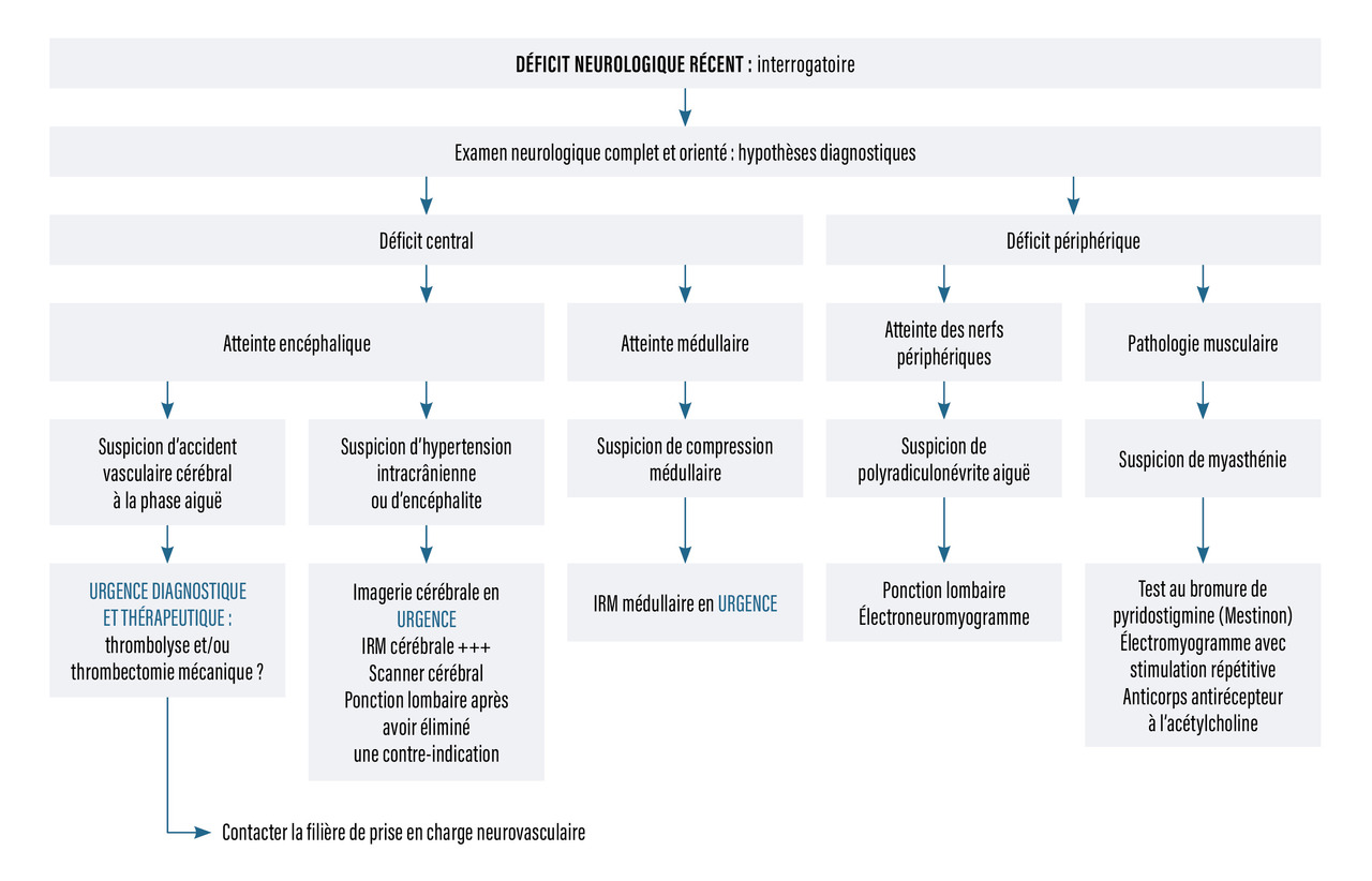 La conduite à tenir (fig. 4 ) face à un déficit neurologique récent doit être connue, notamment du fait de sa gravité potentielle et de la possibilité d’envisager un traitement en urgence, comme cela peut être le cas lors d’un accident vasculaire cérébral, d’une compression médullaire ou du syndrome de la queue de cheval, d’un syndrome de Guillain-Barré et d’une méningo-encéphalite herpétique.