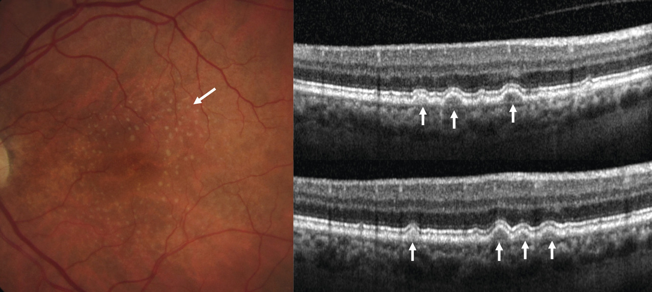 Dans la DMLA précoce, on visualise les drusen (lésions hyperréflectives sous l’épithélium pigmentaire). La rétine en regard est d’épaisseur normale, il n’y a pas de signes exsudatifs (DSR, œdème maculaire) [