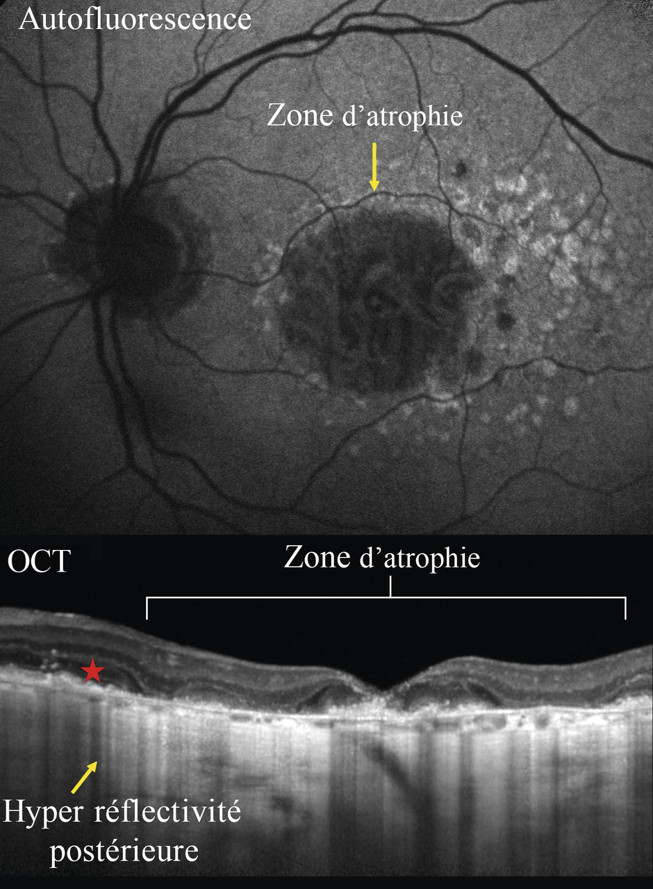 Dans la DMLA atrophique, l’amincissement de l’épithélium pigmentaire et la perte des photo-récepteurs augmentent la réflectivité postérieure des zones touchées (