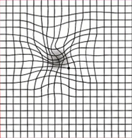 Dans la population générale, des campagnes visent à informer sur la maladie, les facteurs de risque, les signes fonctionnels et la nécessité de consulter en urgence en cas d’alerte : métamorphopsies (déformation des objets observés, comme l’ondulation des lignes droites au test d’Amsler ;fig. 2 ), scotomes, baisse d’acuité visuelle de près.