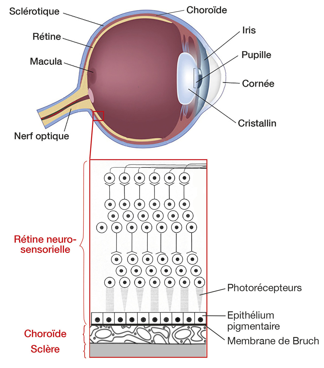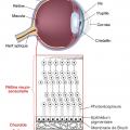 Le vieillissement rétinien se manifeste par un épaississement et des dépôts au niveau de la membrane de Bruch, située entre l’épithélium pigmentaire et la zone choriocapillaire (fig. 1 ). Ils précèdent l’apparition de drusen, résidus de la phagocytose des photorécepteurs par les cellules de l’épithélium pigmentaire, caractéristiques de la DMLA.