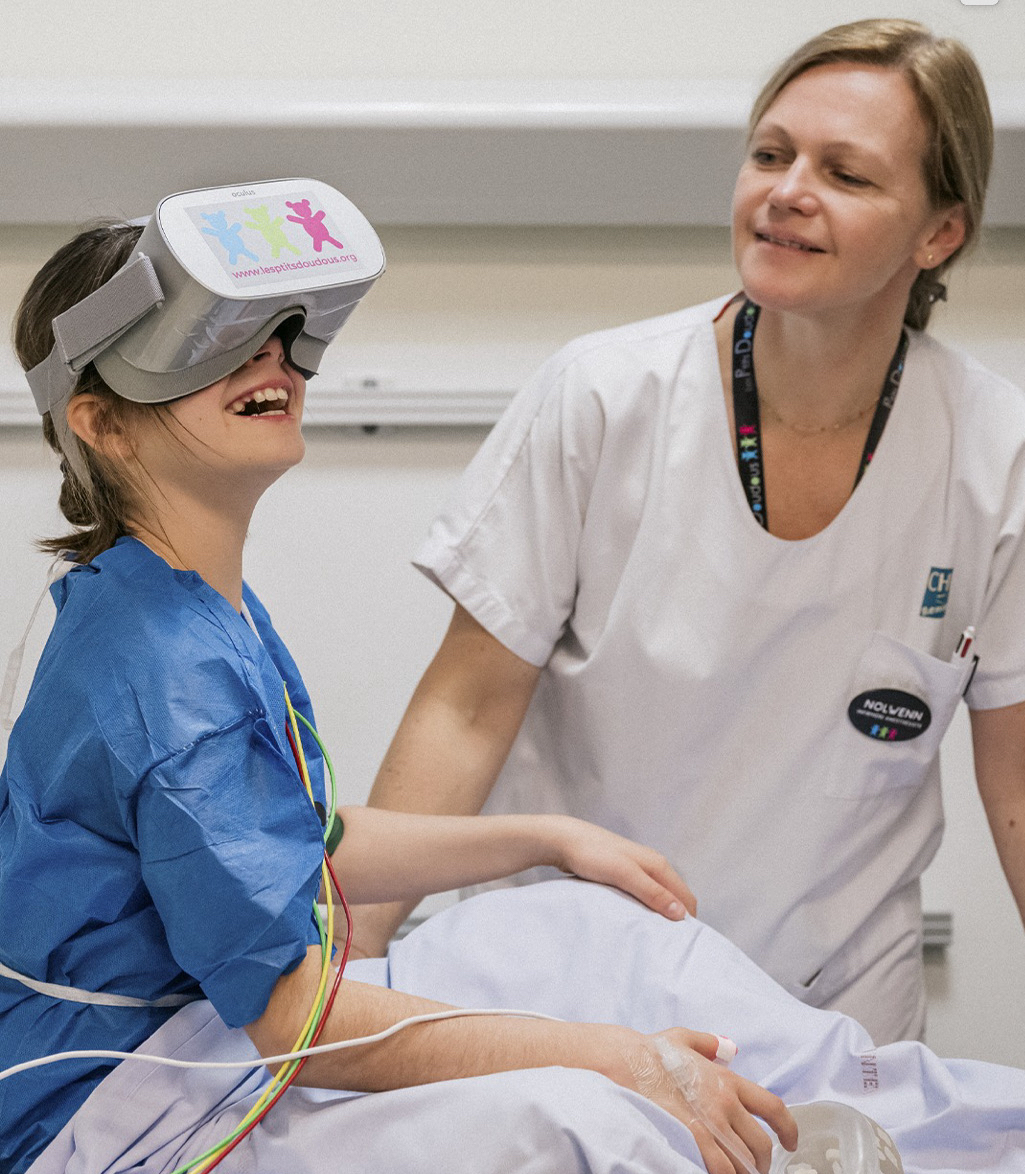 En outre, partant du constat que le jeu peut aider à apaiser les angoisses dues à l’opération, nous avons eu l’idée de créer un jeu immersif sur tablette, « Le Héros, c’est toi ». Le protagoniste est personnalisé pour chaque enfant, qui peut donc s’identifier à lui ; le jeu permet d’explorer un bloc opératoire et tous ses éléments et d’interagir avec les avatars du chirurgien et de l’anesthésiste. Il est couplé à la réalité virtuelle, ce qui permet à l’enfant de mieux se projeter, prendre confiance et de s’engager déjà, à ce stade, vers la voie de la guérison. Ce dispositif a été déployé par 160 associations locales Les P’tits Doudous, réparties sur l’ensemble du territoire national – en métropole et outre-mer – , en Belgique et au Canada.