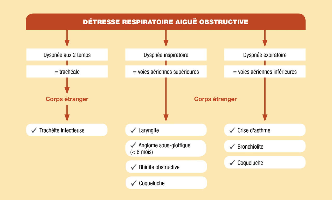 En cas de mauvaise tolérance, l’enfant peut présenter une dyspnée inspiratoire avec des signes de lutte respiratoire.