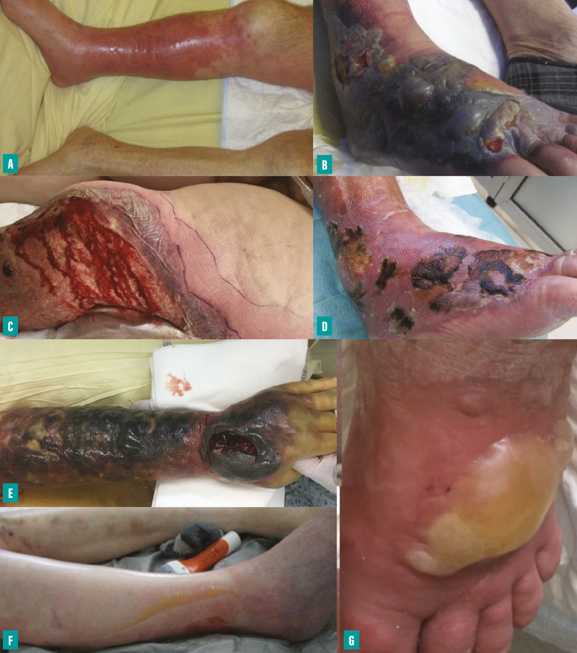 Ainsi, devant des lésions cutanées faisant évoquer une DHBN-FN, il convient d’éliminer la forme trompeuse bulleuse hémorragique de l’érysipèle, l’infection sur pied diabétique ainsi que les atteintes non infectieuses représentées par le pyoderma gangrenosum, les lésions ischémiques et le syndrome des loges.