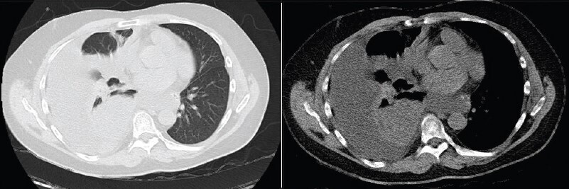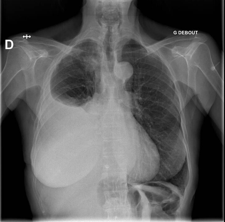 Vous n’observez pas de signe de lutte respiratoire, la dyspnée est silencieuse. L’auscultation pulmonaire retrouve une diminution du murmure vésiculaire à droite, accompagnée de sibilants localisés à mi-hauteur, la percussion révèle une matité. Les bruits du cœur sont réguliers, sans souffle. Il n’y a pas d’œdème des membres inférieurs, les mollets sont souples et indolores. Le reste de l’examen clinique est sans particularité.