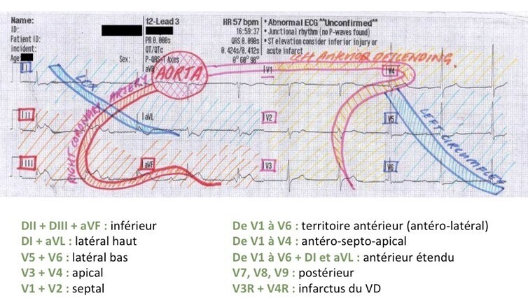Dans ce cas clinique, l’infarctus est vraisemblablement antéro-latéral (le sus-décalage existe de V1 à V4 et en DI, aVL). Il est probable qu’on ne vous piégera pas de façon pointue sur les territoires ECG. Sachez simplement au moins différencier le territoire antérieur du territoire inférieur. En effet, les infarctus antérieurs et antéro-latéraux se compliquent de troubles de conduction de haut degré en rapport avec une ischémie du nœud atrio ventriculaire (cela implique la pose d’une sonde d’entraînement électro systolique en urgence), alors que les troubles de conduction des infarctus inférieurs sont liés à une hypertonie vagale et répondent bien à l’atropine.
