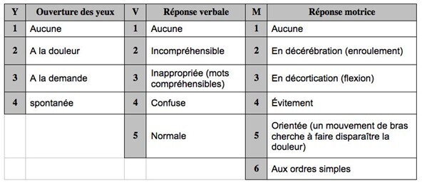 Un petit rappel du mode de calcul du score de Glasgow (ici Y1 + V2 + M4 = 7) :