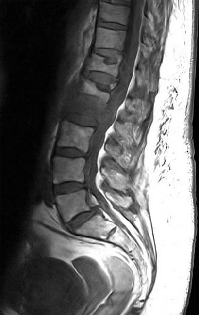 L’IRM rachidienne réalisée montre l’image suivante et le radiologue confirme le caractère suspect de malignité de la fracture. L’examen clinique de la patiente est inchangé. La masse pulmonaire a été biopsiée et vous êtes en attente des résultats. Figure 3 (Salomé Abdellaoui, La Revue du Praticien)