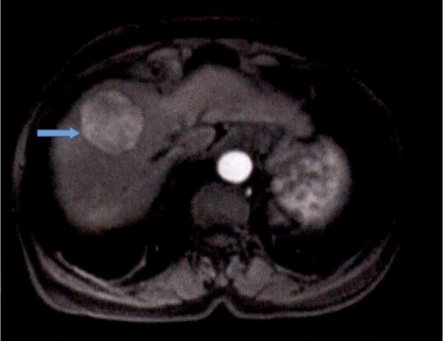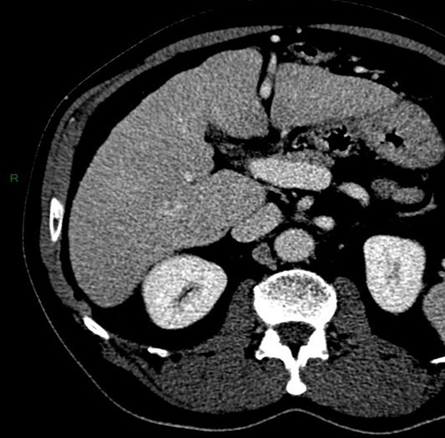 À l’examen clinique, vous retrouvez des signes d’insuffisance hépatocellulaire et d’hypertension portale associés à une hépatomégalie homogène à deux travers de doigts avec un bord inférieur tranchant. Le patient est marbré. Il existe une discrète ascite sans encéphalopathie associée. La palpation abdominale est indolore. Les constantes sont les suivantes : tension artérielle (TA) à 95/55 mmHg, pouls à 130/min, saturation en oxygène (SaO2) à 98 %, apyrétique.