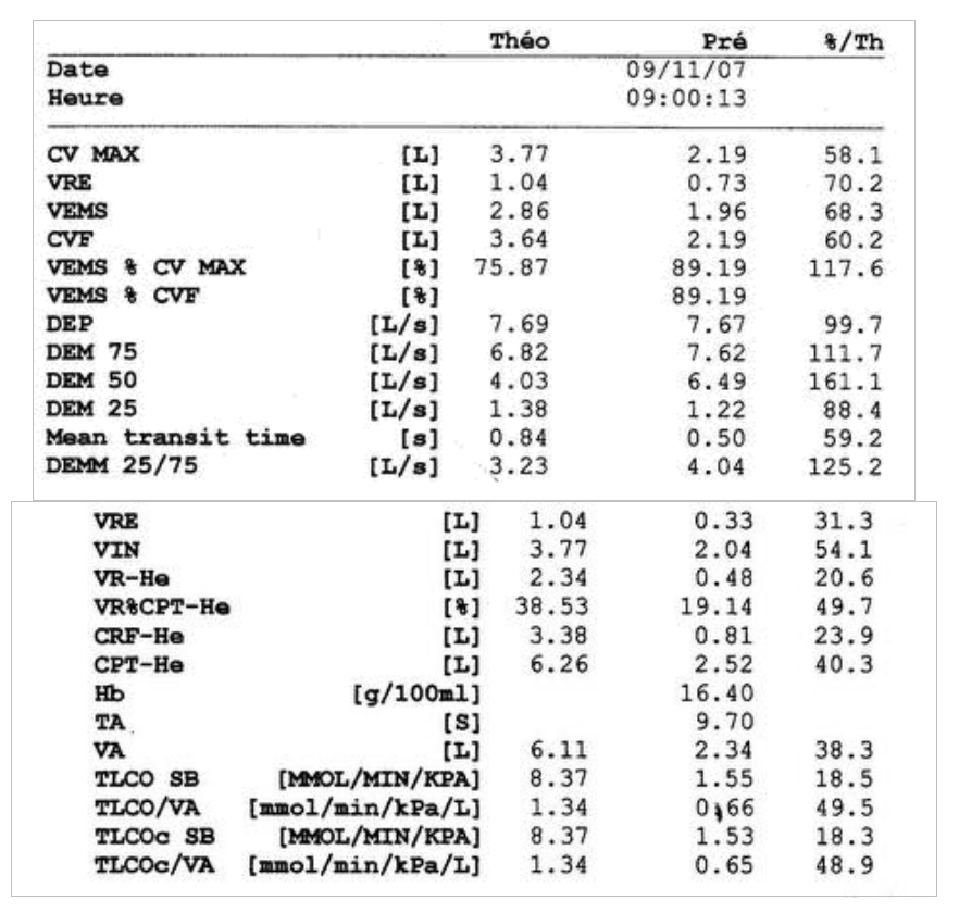 Sur des EFR vous pouvez distinguer 3 colonnes : une dénommée « mesures » qui contient les valeurs mesurées chez le patient, une seconde dénommée « Théo » qui est la colonne contenant les valeurs théoriques attendues chez ce patient et enfin une troisième colonne « % Théo » dans laquelle est exprimé, pour chaque paramètre, le pourcentage de la valeur mesurée par rapport à la valeur théorique.
