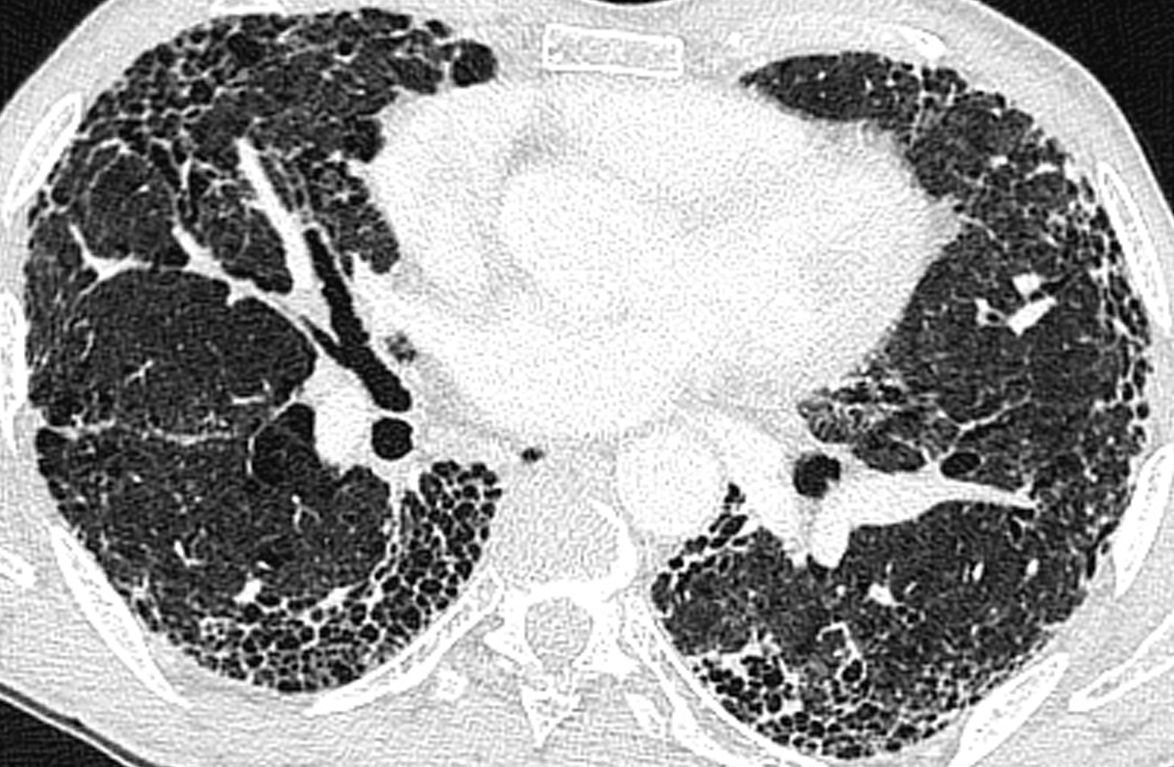 1) de la destruction parenchymateuse : typiquement les microkystes (rayon de miel) qui sont de petits « trous », avec paroi, à prédominance sous-pleurale ;