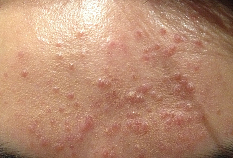 Finalement, elle ne reviendra pas à son rendez-vous de suivi. Trois ans plus tard, elle vient vous revoir pour l’apparition depuis deux mois de lésions papuleuses, infra-centimétriques, érythémateuses, non prurigineuses, non pustuleuses et non kystiques, exclusivement sur le front. L’érythème noueux avait disparu spontanément après quelques semaines.