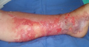 On objective ici principalement des érosions post-bulleuses mais pas d’ulcération.