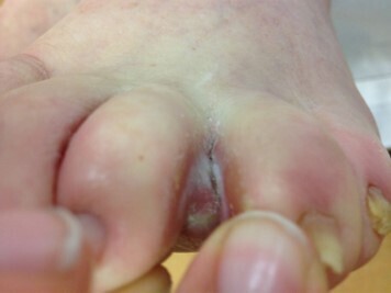 À l’examen clinique vous constatez cette lésion au niveau de son 4e espace inter-orteils (fig. 2). Figure 2 (Dr Antoine Bertolotti, La Revue du Praticien)