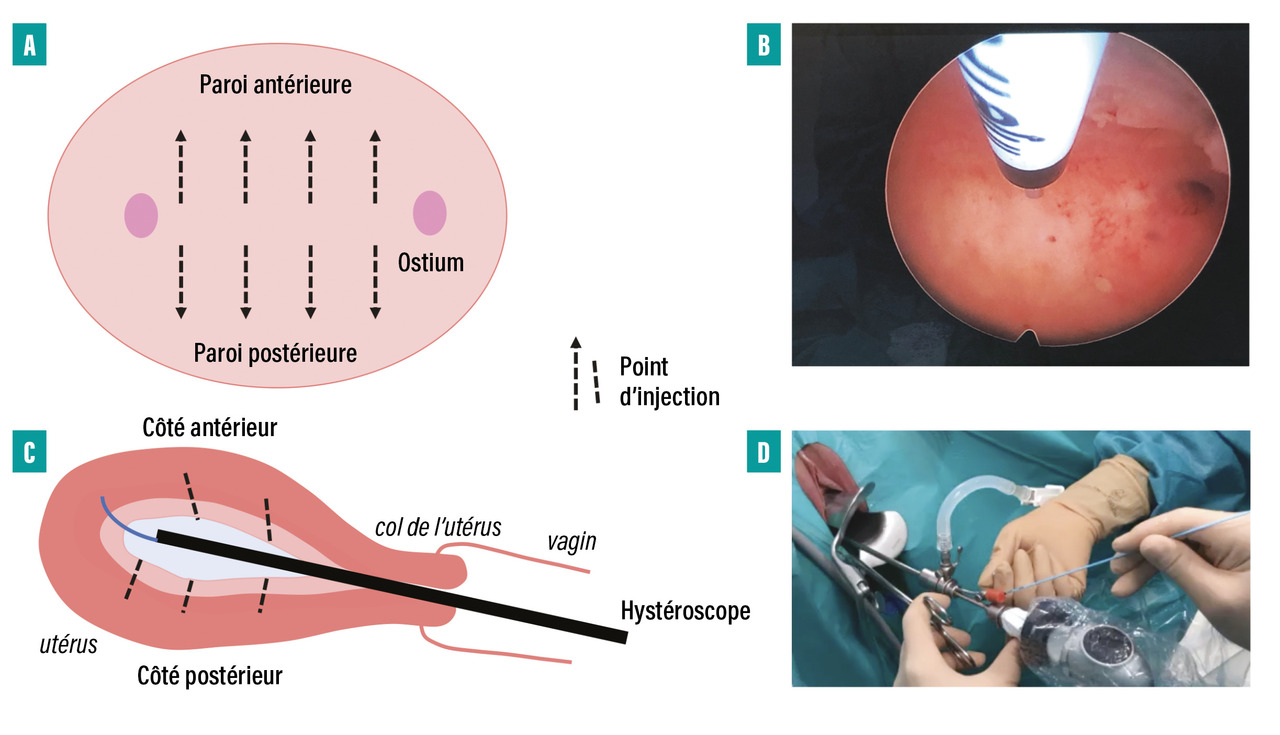 La toxine botulinique présente plusieurs mécanismes d’action : décontraction musculaire bien sûr, mais aussi diminution de l’inflammation neurogène réduisant l’hyperalgésie périphérique et réduction de l’hyperalgésie centrale. Les injections de toxine botulinique dans le myomètre sous hystéroscopie permettent le contrôle de l’hypertonie ou de l’hypercontractilité utérine et annihilent l’information nociceptive durablement. Même si elle n’est pas de première intention, cette technique a montré son intérêt et s’avère très prometteuse dans les dysménorrhées sévères, la douleur pelvienne utérine de l’endométriose, les douleurs myofasciales ou les dyspareunies (figure).44